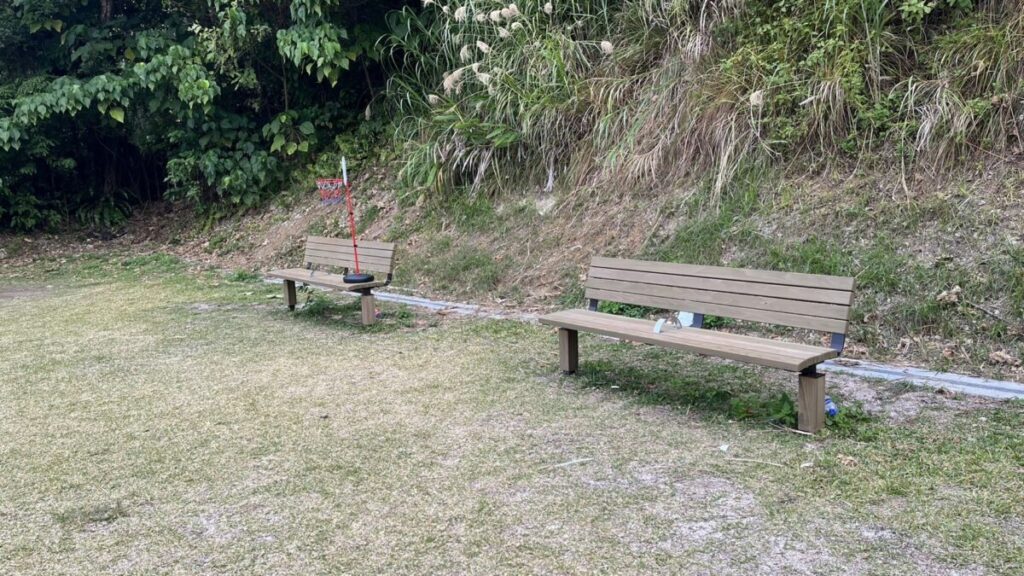 遊具広場を見渡せる位置にベンチがいくつか並んでいます。森に面していて落ち着いた雰囲気ですが、時期によっては虫対策が必要そう 🐝
