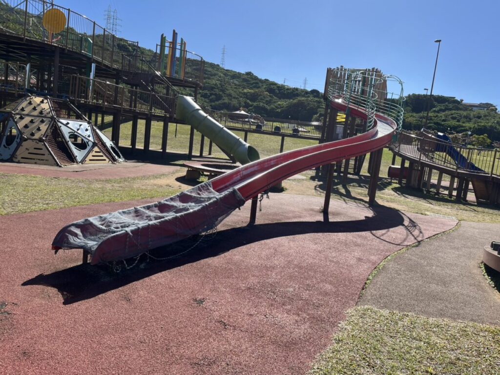 トランポリンのすぐ隣にある、あの迫力満点な巨大滑り台付き遊具も、現在は一部修理中で使用不可となっていました。早く元気な姿(?)に戻ってほしいですね ✨