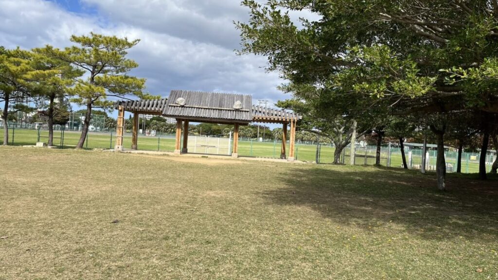 公園内には、屋根付きのベンチが複数設置されています。沖縄の強い日差しを避けながら子供を見守れるのは嬉しいポイントです。自動販売機も近くに完備されています。🥤