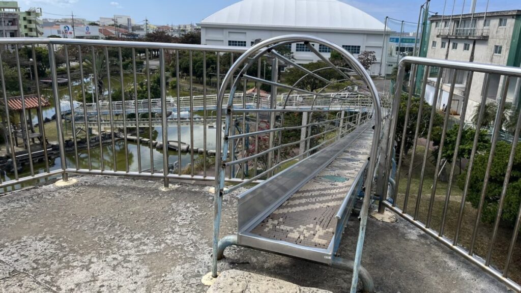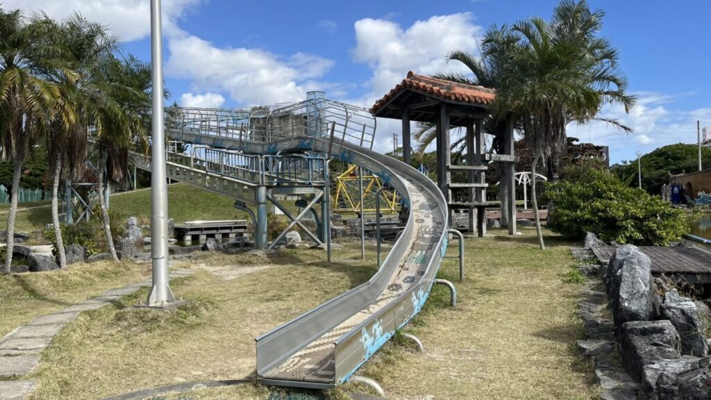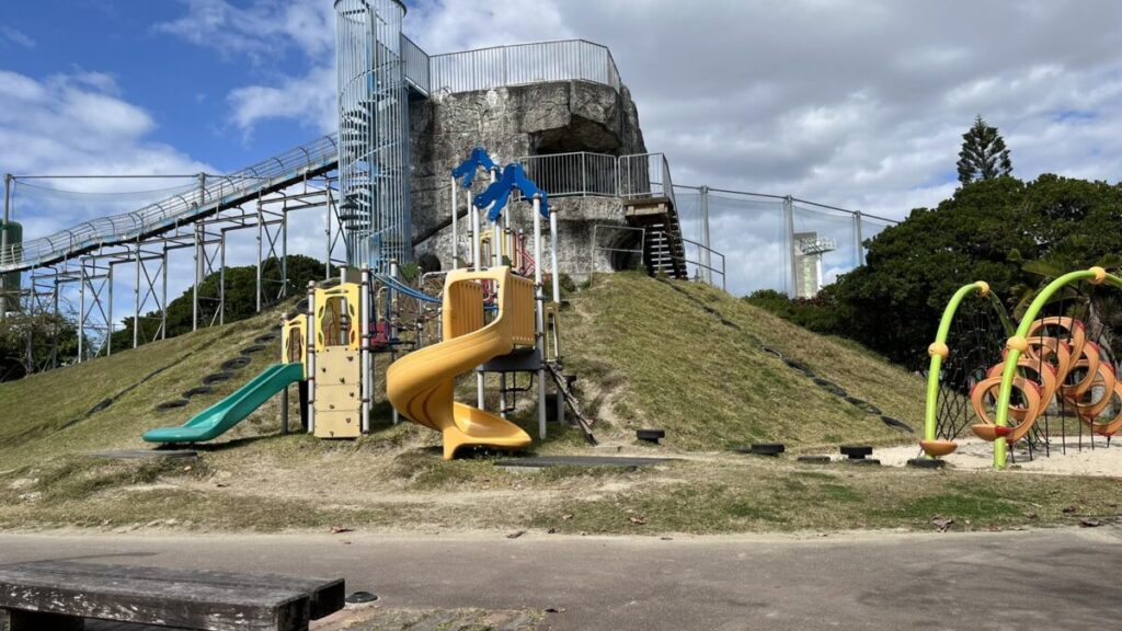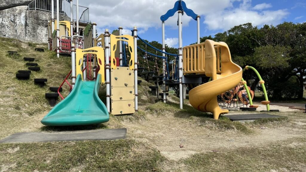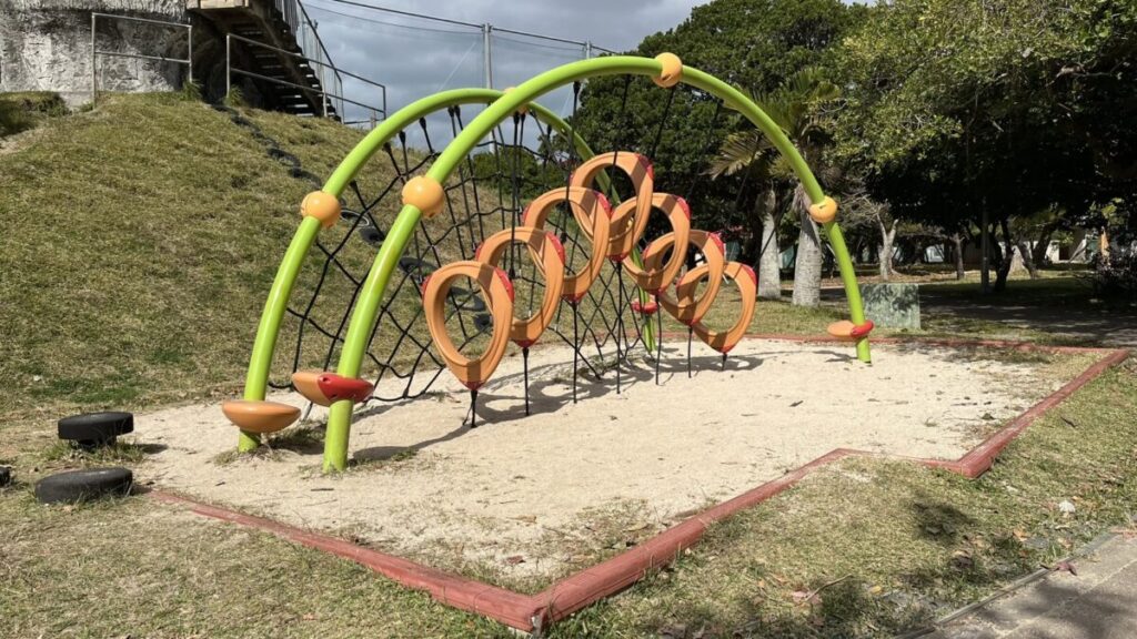 糸満市の西崎エリアにあるこの公園は、アスレチック要素の強い遊具と広大な芝生が魅力です。