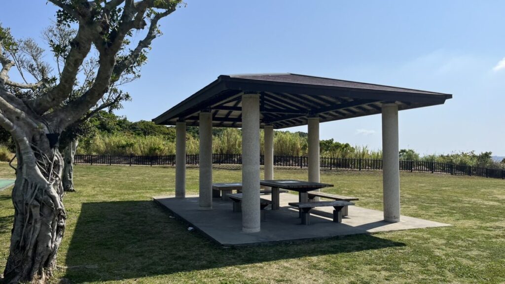 公園内には、しっかりとした屋根付きの東屋(あずまや)があります。🧺