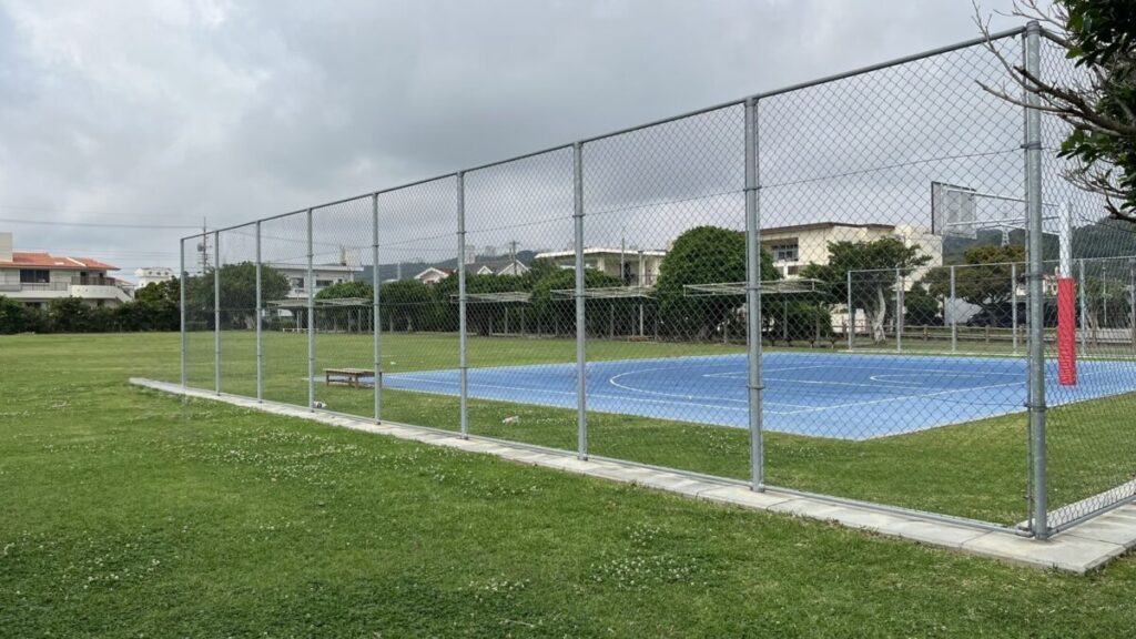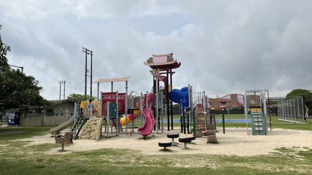 中城村民体育館のすぐ隣にあるこちらのエリアは、大きなコンビネーション遊具がドーンと構える、活気ある広場です。