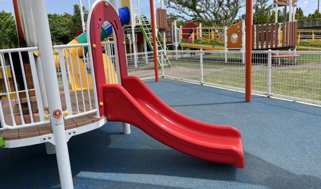 チューブ状に一気に滑り降りるタイプや、波打つスリルを楽しめる青い滑り台、そして鮮やかな赤の滑り台など、遊びごたえ抜群なのが伝わってきますね。